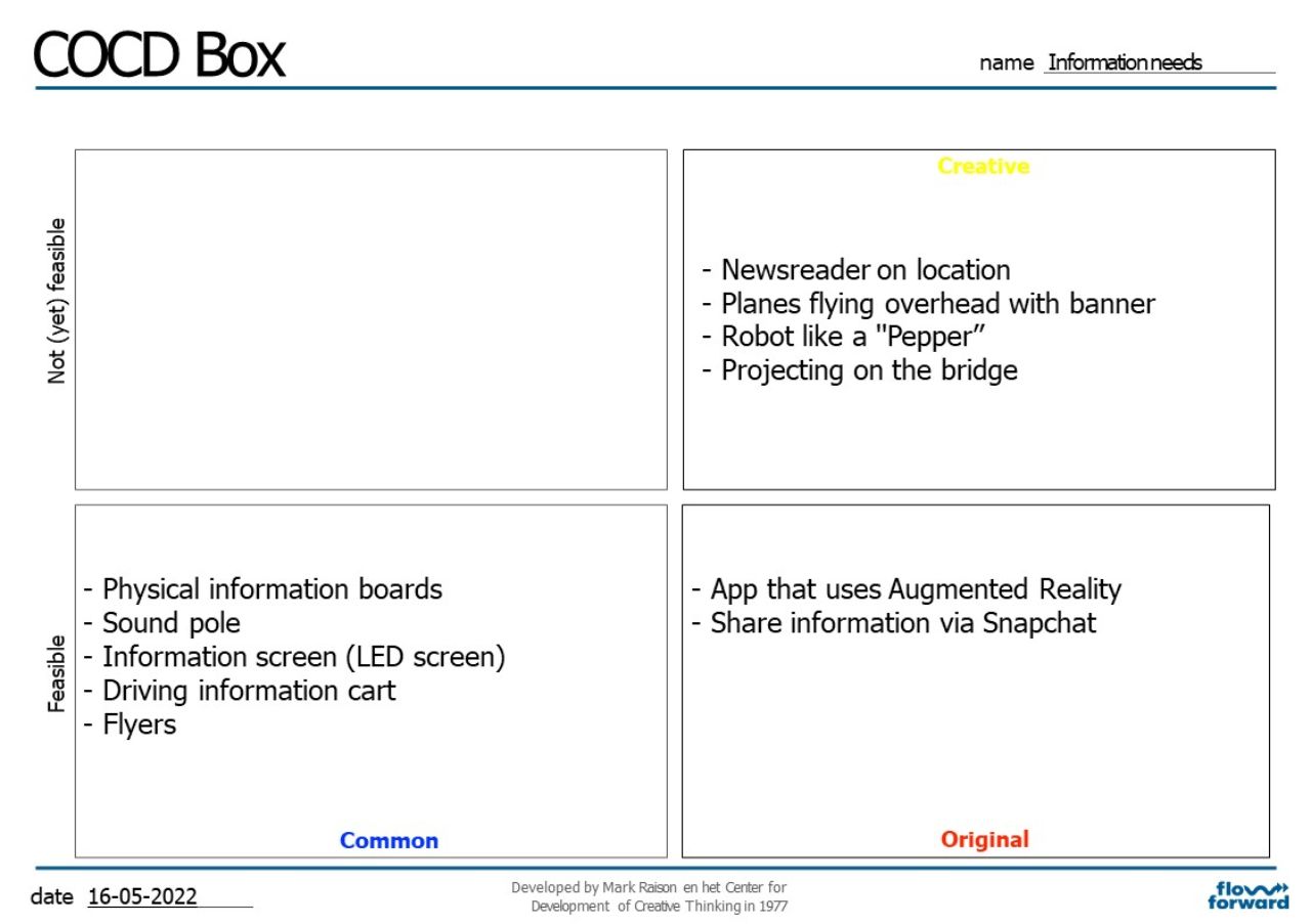 You start the work session with a presentation in which you explain the context from which the list of ideas emerged. Also, make sure you take the participants into the context of your project. You could do this in a presentation and end up presenting the numbered list of ideas. Numbering the ideas is important so that you can easily continue working at step 2 without having to completely copy the ideas. Explain the different quadrants of the COCD Box. The canvas consists of: