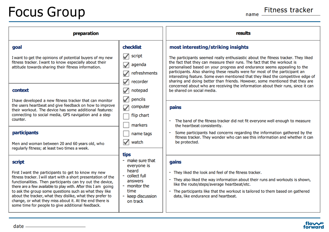 Use the Focus Group template to prepare for the Focus Group meeting. The template can also be used to capture the results. Have a look at the example of FitnessTracker to see how they have